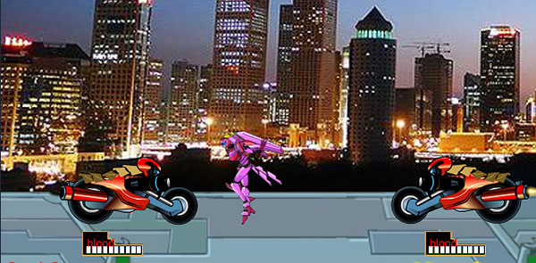 This is one of the older Transforms fighting games where you control robots only with your keyboard. Interesting thing is that you can play in both single (1P) and multi- that is 2 player mode (2p). There are 9 levels, where each one has different background and different 'enemy-killed' count required.